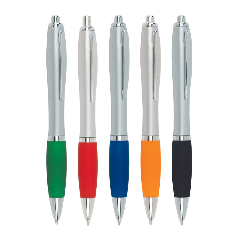 Plástico. Cuerpo curvo, pulsador, clip y puntera color plata. Grip de goma de color. Retráctil. Tinta negra.