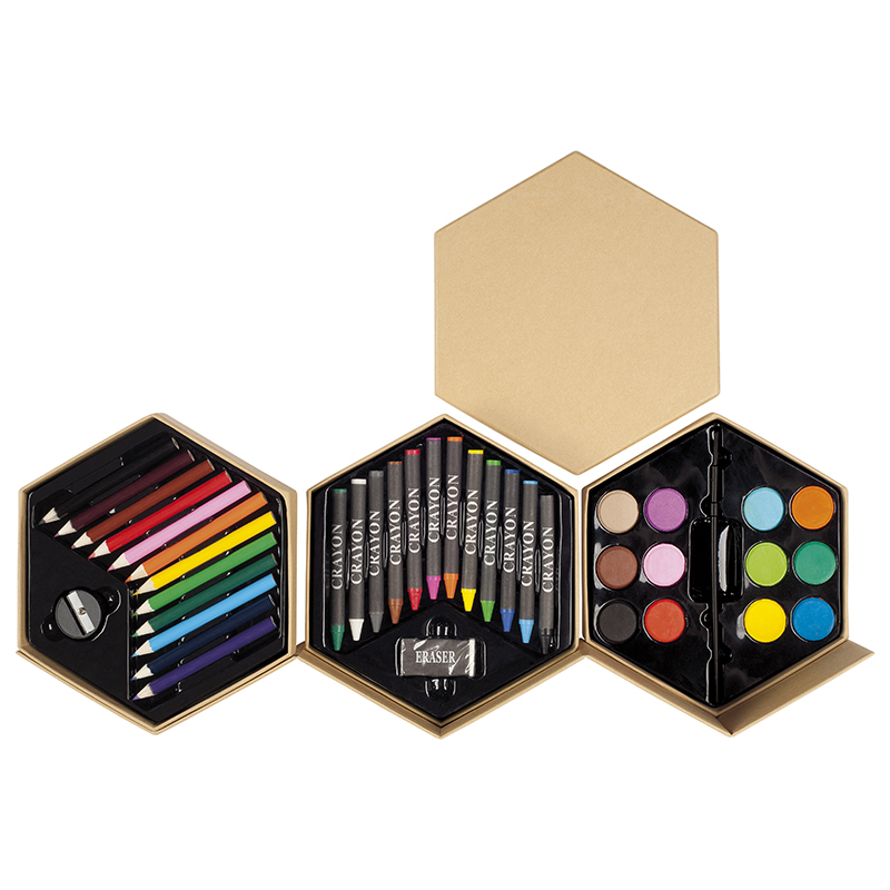 16 x 8 cm. (cerrado) 44 x 8 cm. (abierto). Cartón. Set de pinturas en forma de hexágono. 12 lápices de colores, 1 sacapuntas, 12 crayones, 1 goma de borrar, 12 acuarelas y 1 pincel.